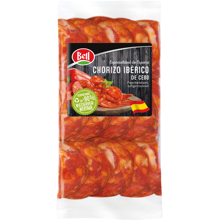 Schweinefleisch (vom Ibérico- Schwein), Speisesalz, Paprika, Dextrin, Erbsenprotein, Dextrose, Gwürze, Emulgator: Polyphosphate, Antioxidationsmittel: Natriumascorbat, Konservierungsstoff: Natriumnitrit. 100g Chorizo werden aus 141g Schweinefleisch (vom Ibérico- Schwein) hergestellt.