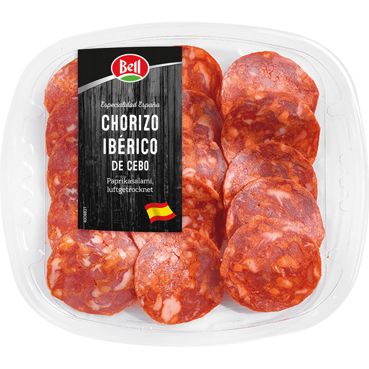 Schweinefleisch (vom Ibérico- Schwein), Speisesalz, Paprika, Dextrin, Erbsenprotein, Dextrose, Gwürze, Emulgator: Polyphosphate, Antioxidationsmittel: Natriumascorbat, Konservierungsstoff: Natriumnitrit. 100g Chorizo werden aus 141g Schweinefleisch (vom Ibérico- Schwein) hergestellt.