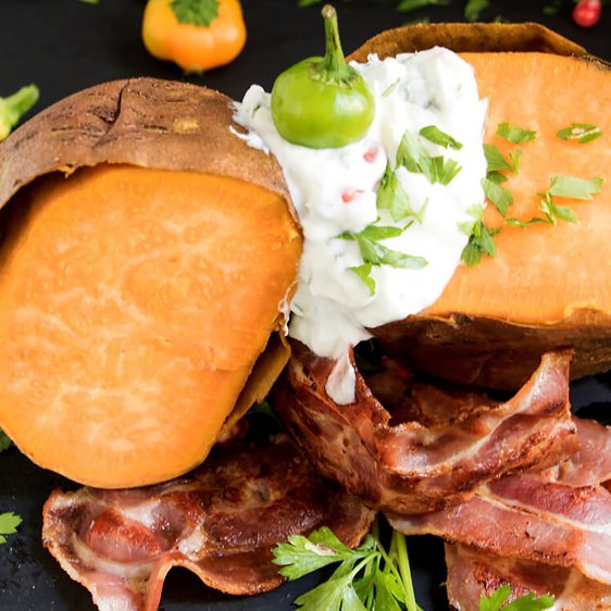 Backkartoffeln mit Quark und Jamón Ibérico de Cebo oder Salchichón