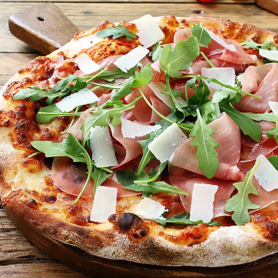 Pizza Margherita mit Ibérico de Cebo und Rucola